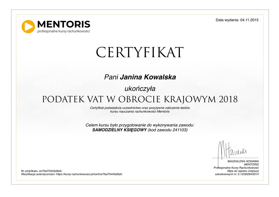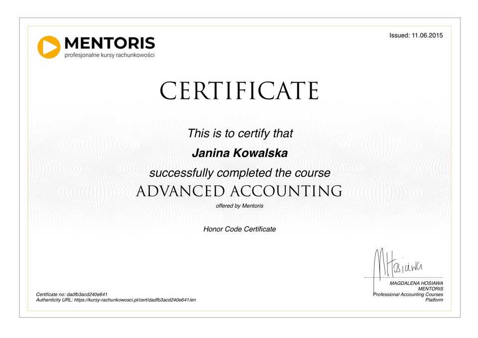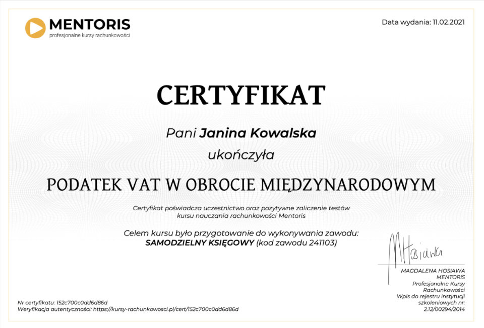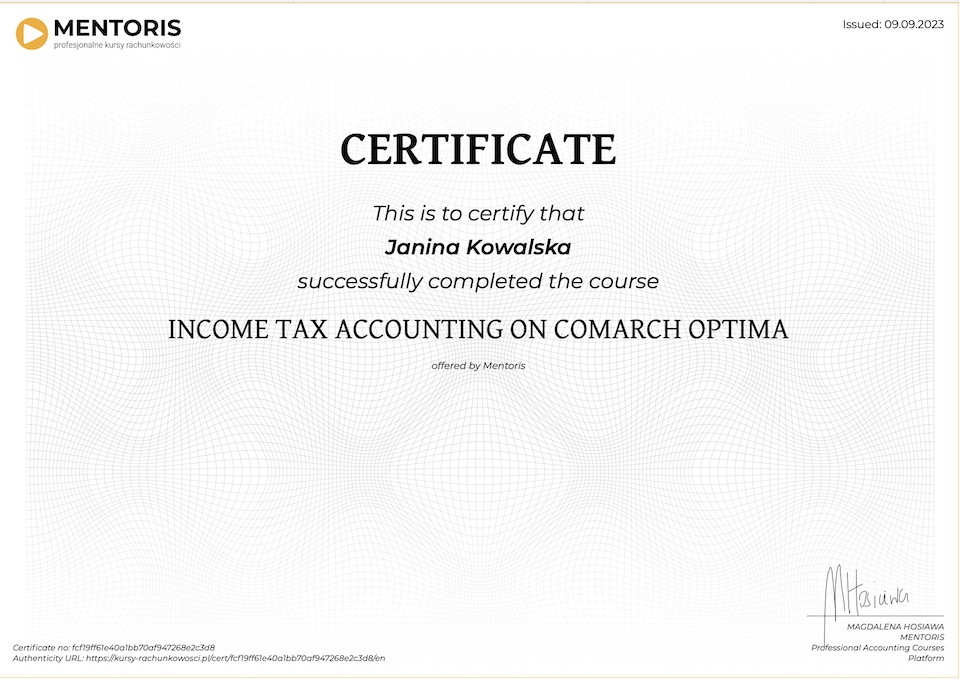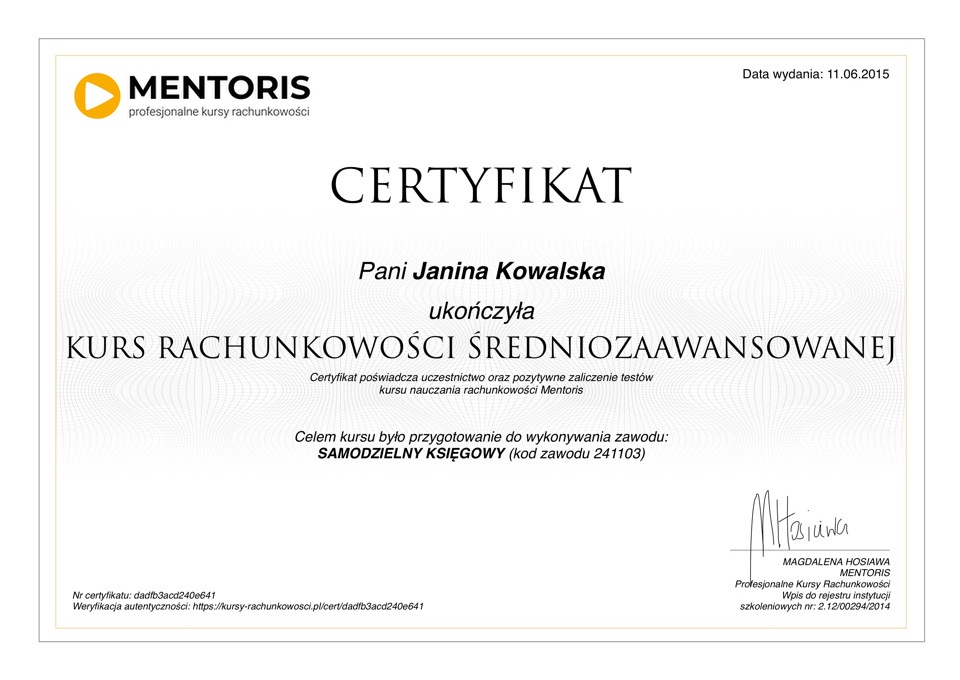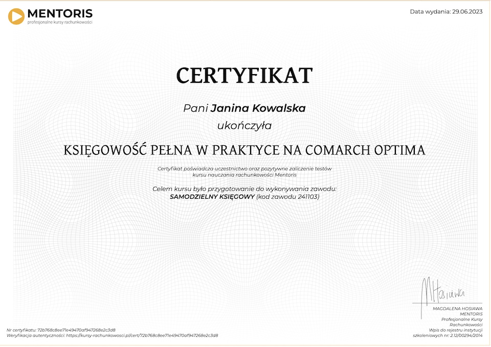 Do każdego kursu przygotowywany jest certyfikat w języku polskim i angielskim: